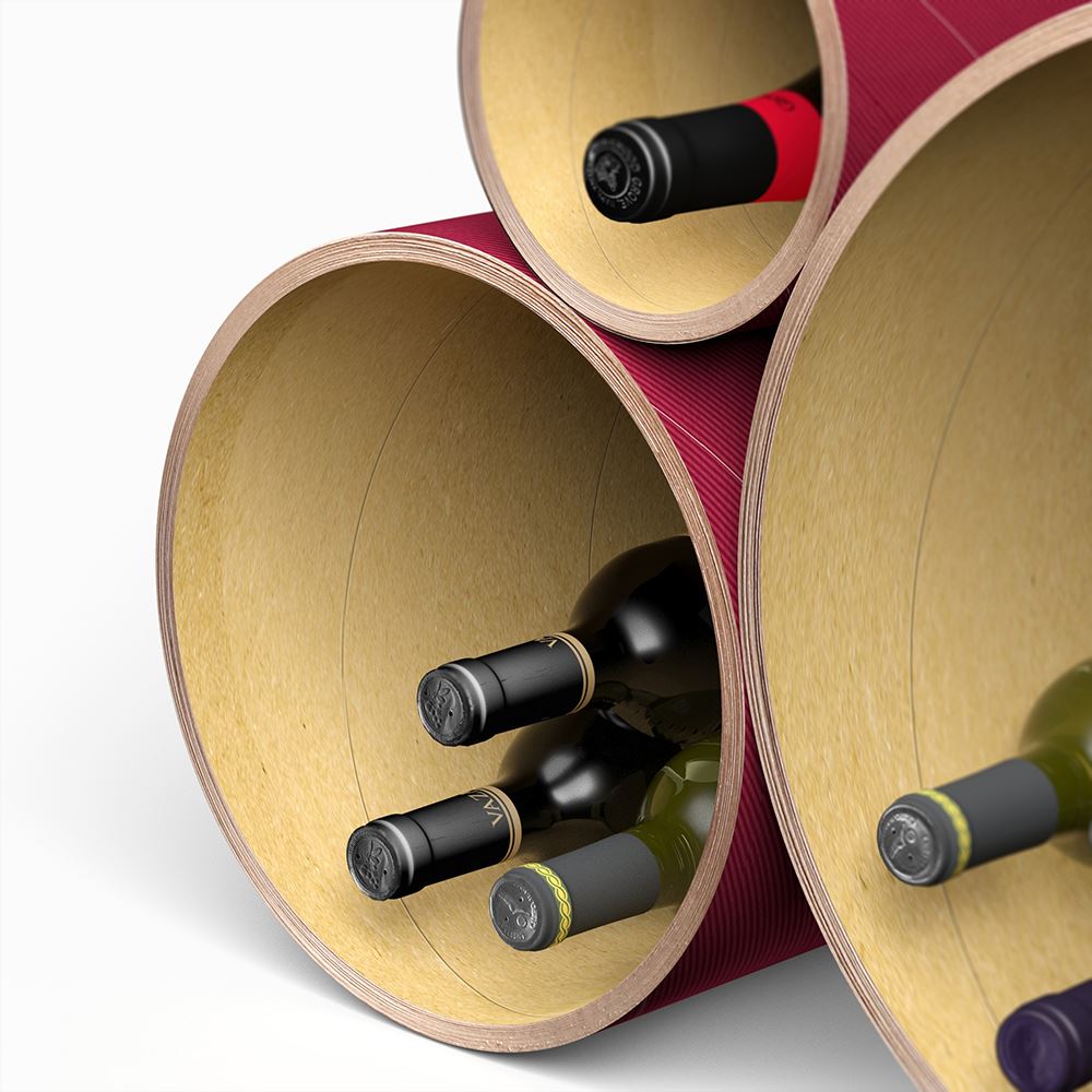 The compressed cardboard tubes, proposed in three different diameters, are made with a recycled material and fixed between them taking the shape of the grapes and becoming original wine bottle holders that marry the eco-sustainable design.