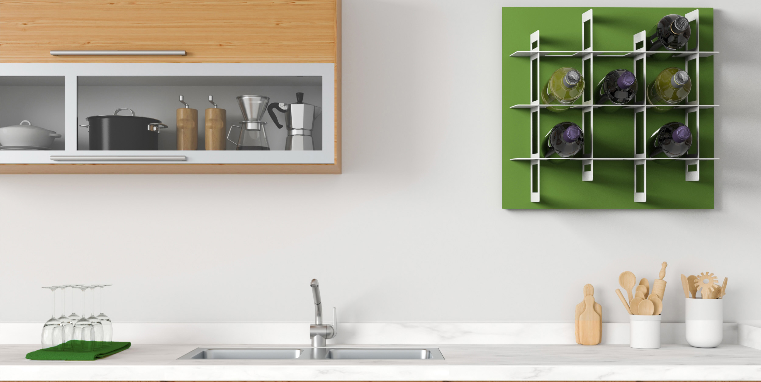 PICTA wall wine rack has nine bottle holders, designed to guarantee the right inclination and maximum bottle stability.